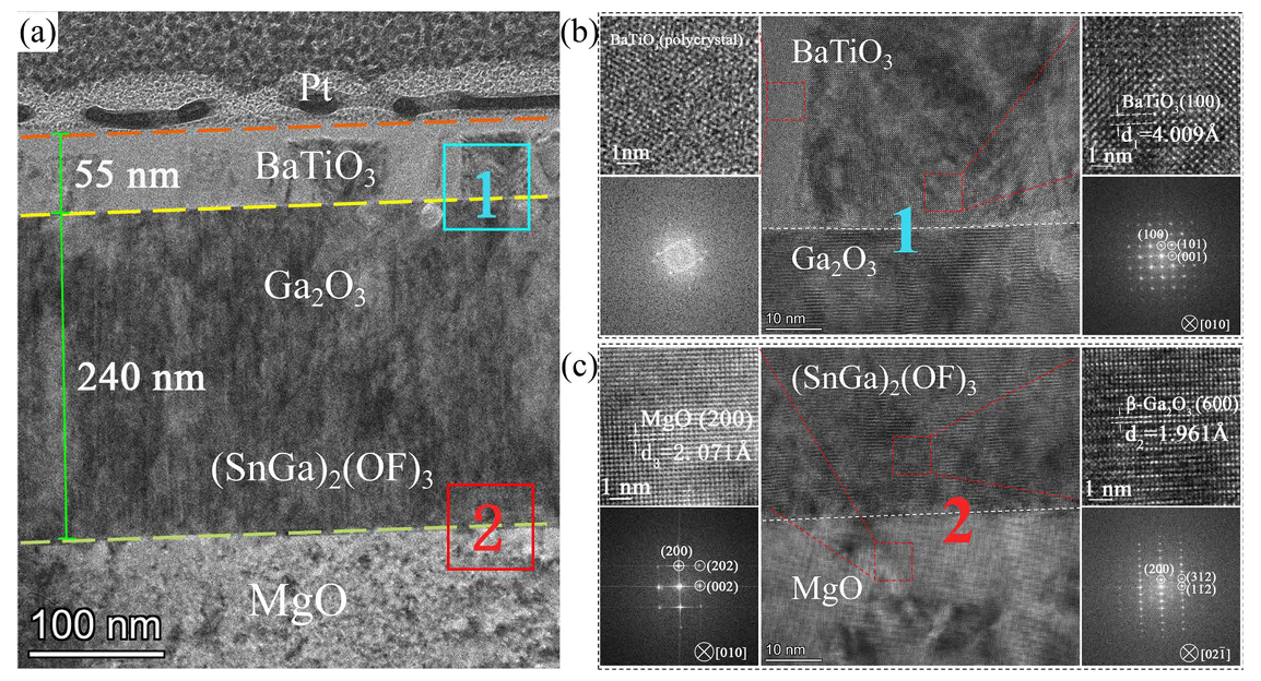 图 2. (a) BaTiO₃/Ga₂O₃/(SnGa)₂(OF)₃/MgO 多层薄膜的截面透射电子显微镜(TEM)图像;(b) BaTiO₃/Ga₂O₃ 界面和 (c) (SnGa)₂(OF)₃/MgO 界面的高分辨 TEM(HRTEM)图像。插图为虚线框标记区域的放大视图及对应的快速傅里叶变换(FFT)图案。
