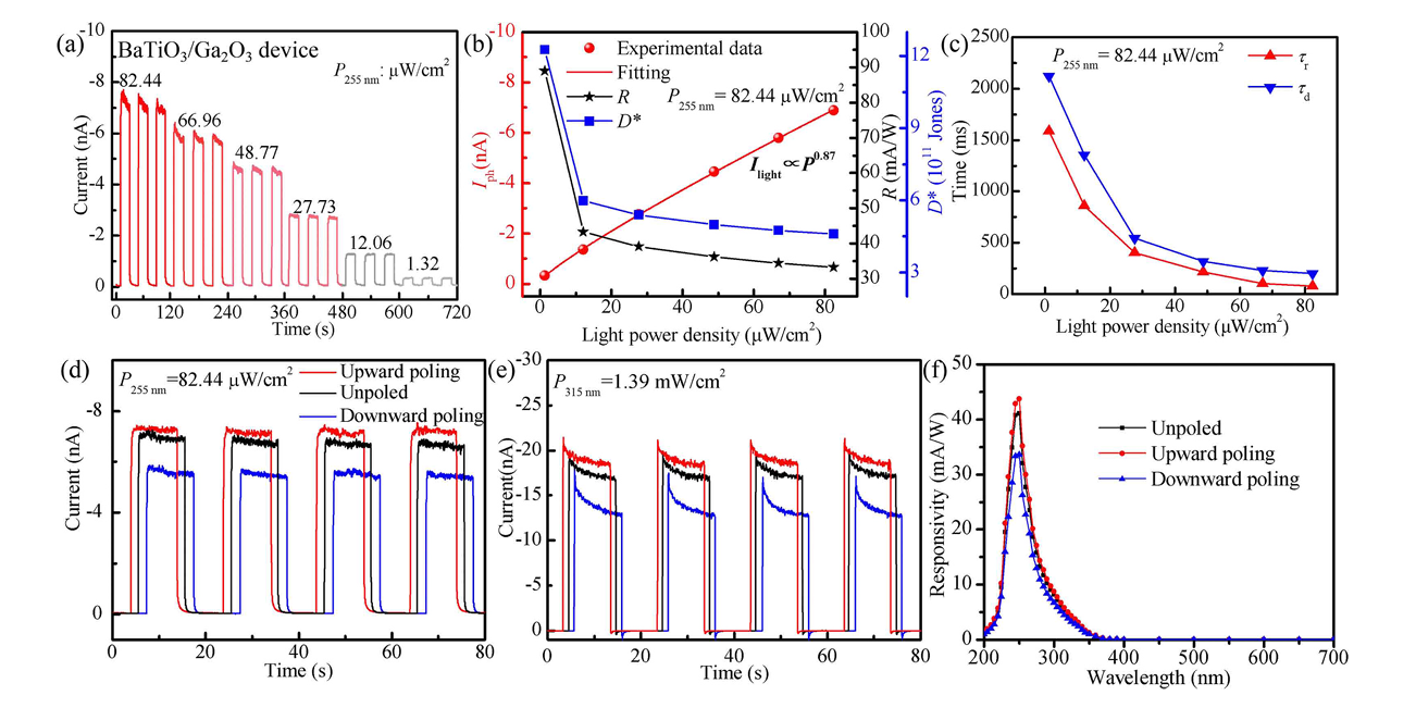 图 5. (a) BaTiO₃/Ga₂O₃ 器件在 255 nm 入射光下测得的光强依赖光电流响应。(b) BaTiO₃/Ga₂O₃ 器件的光强依赖 Iₚₕₒₜₒ、响应度 R 和探测度 D*,(c) 响应时间 τᵣ/τd。(d–e) BaTiO₃/Ga₂O₃ 器件在不同极化状态下对 255 nm 和 315 nm 入射光的光电流响应。(f) BaTiO₃/Ga₂O₃ 器件在不同极化状态下的光谱响应度。