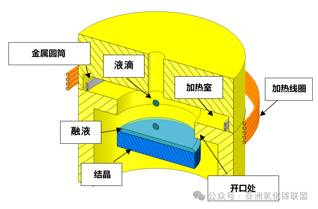 采用感应加热※3对金属圆筒进行加热,通过提高加热室内的温度,使晶体(籽晶)表面受到来自加热室开口部的辐射而被加热熔融。借助该开口部的形状,可更容易地控制晶体表面的温度分布,从而更易实现与晶体直径相匹配的最佳温度分布,有利于实现大口径化。此外,在使晶体下降的同时,以液滴形式连续向晶体表面供给原料熔液,从而无需使用以往所需的铱制坩埚即可进行晶体生长(图2)。