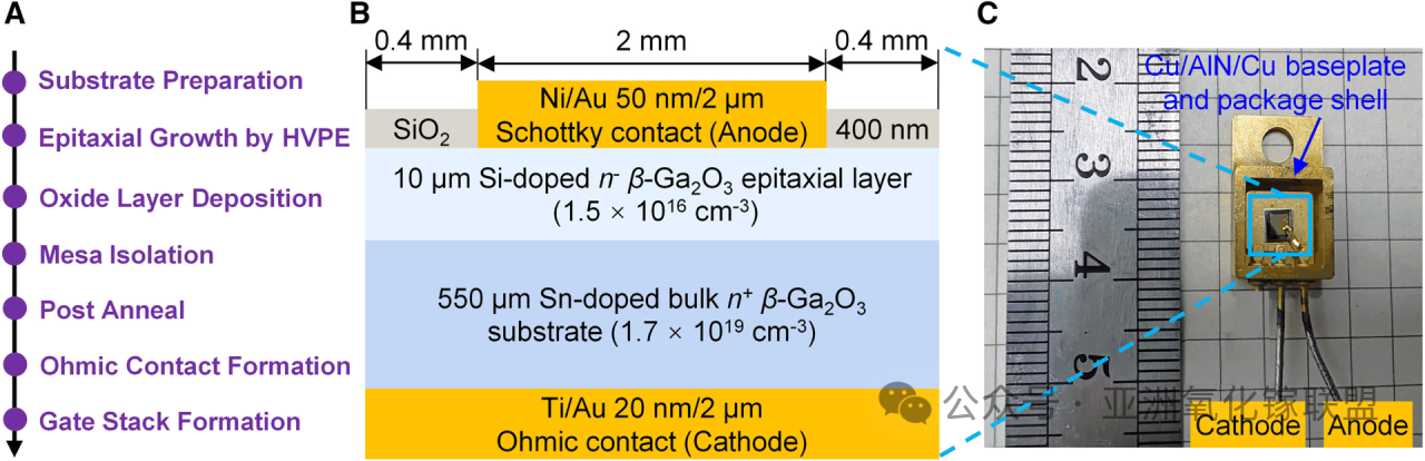 图 12 垂直β-Ga2O3 SBD 的制备。(A) 器件制备主要步骤示意图。(B) 横截面结构示意图。(C) 整体封装器件光学图像。