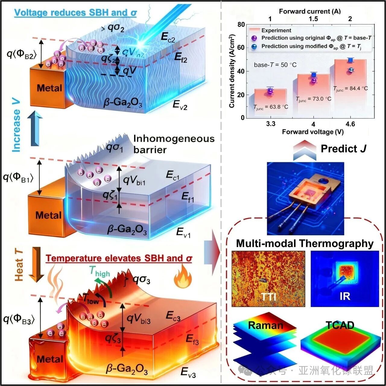 β-Ga2O3 由于其超高临界电场(8 MV/cm)、优异的 Baliga 评价因子(BFOM = 3444,相比硅)以及低成本晶体生长兼容性,被认为是下一代高功率电子器件的关键材料。其垂直结构的肖特基势垒二极管(SBD)在高压、高温和高能效功率转换系统中具有广阔应用前景。然而,要充分发挥 β-Ga2O3 的性能,需要解决肖特基势垒工程中的关键问题,尤其是电压和温度依赖的肖特基势垒高度(SBH)行为及其空间不均匀性(σ),这直接影响器件的电流传输机制和可靠性。现有研究虽然在热管理(如纳米孔基底或异质结构)和电性能优化(如表面钝化与掺杂)方面取得进展,但对具有非均匀肖特基势垒器件的微观电流传输机制仍缺乏清晰理解。传统的 SBH 测量方法(单温度或低频测量)通常忽略电压-温度耦合效应,而势垒不均匀性(由缺陷、界面粗糙度或成分差异引起)会导致电流集中、局部发热和器件早期失效。此外,静态 I-V 测量和单模热成像等传统表征方法缺乏捕捉电压-温度瞬态变化的时间分辨率,以及解析纳米/微米尺度温度梯度的空间分辨率,限制了对动态 SBH 演化机制的理解。