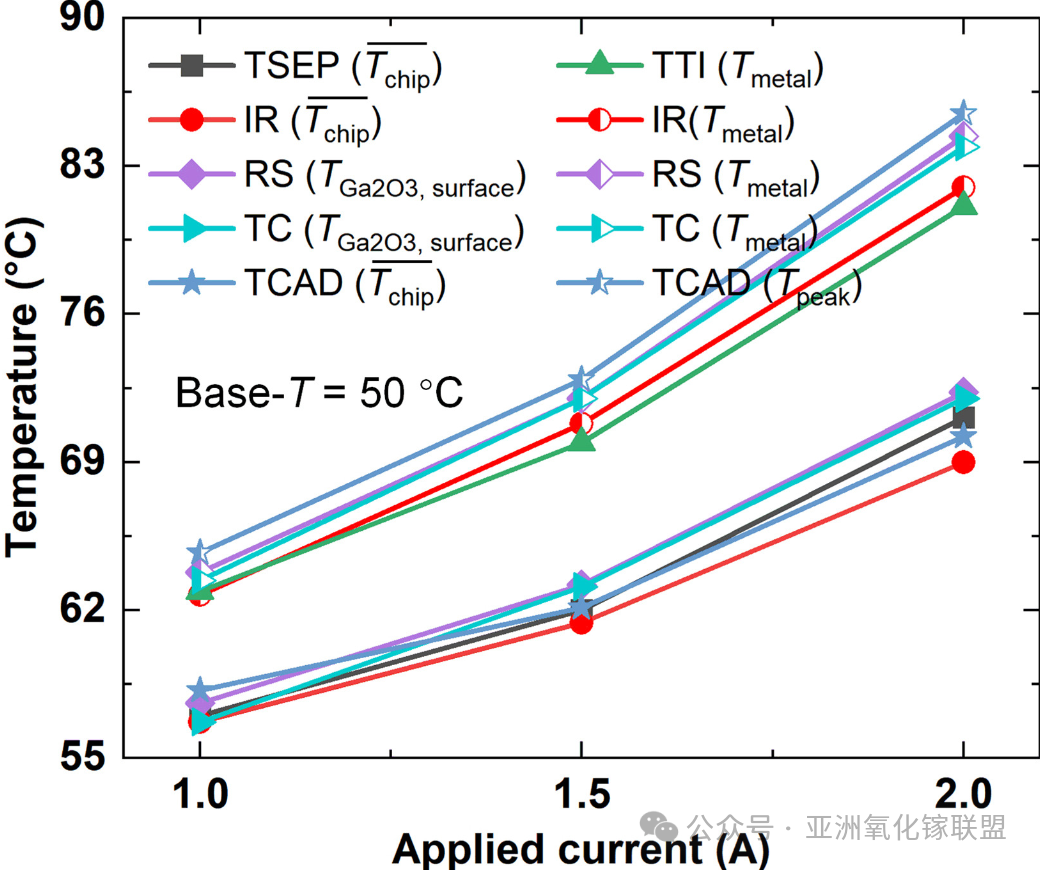 图 9 不同正向电流下的多模式热成像。在固定加热台温度 50 °C 下的温度分析对比,包括芯片平均温度 (¯Tchip)、金属电极温度 (Tmetal)、β-Ga2O3 外表面温度 (TGa2O3, surface) 及器件峰值温度 (Tpeak),由不同热成像技术测得。
