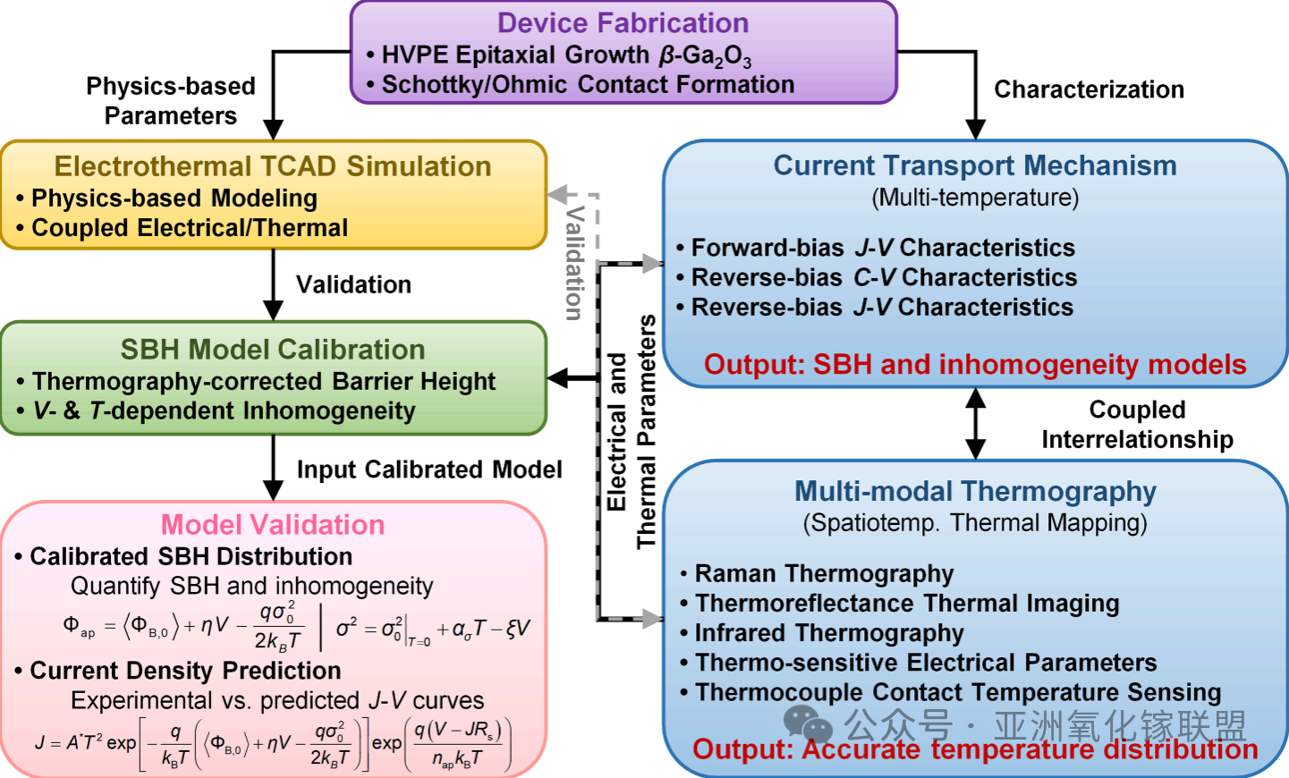 通过多模态热成像校准框架,揭示了温度诱导的肖特基势垒增加和不均匀性加剧,而电压则缓解了这两者。修改后的势垒模型显著提高了电流密度预测的准确性,为精确量化不均匀势垒和合理设计势垒工程接触提供了新的见解。该研究为 β-Ga2O3 SBDs 在高功率应用中的可靠性提升奠定了基础。