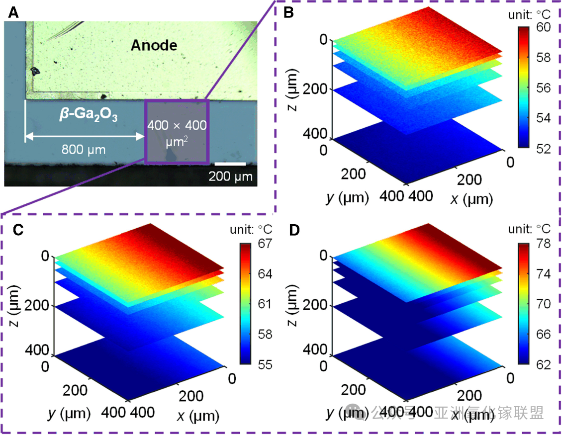 图 8 不同深度平面的 3D 拉曼热成像映射。(A) 垂直β-Ga2O3 SBD 的 400 × 400 μm² 区域。(B) 加热台固定温度 50 °C 时 1 A。(C) 加热台固定温度 50 °C 时 1.5 A。(D) 加热台固定温度 50 °C 时 2 A。