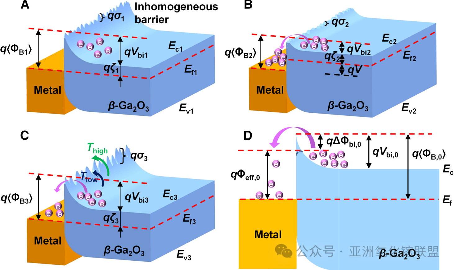 图 7 不同条件下的肖特基势垒分布。(A) T = T1, V = 0, ⟨ΦB⟩ = ⟨ΦB1⟩, σ = σ1。(B) T = T2 = T1, V > 0, ⟨ΦB⟩ = ⟨ΦB2⟩ < ⟨ΦB1⟩, σ = σ2 < σ1。(C) T = T3 > T1, V = 0, ⟨ΦB⟩ = ⟨ΦB3⟩ > ⟨ΦB1⟩, σ = σ3 > σ1。T 为温度,V 为正向偏压,⟨ΦB⟩ 与 σ 分别为势垒高度均值与标准差。(D) 热平衡下 MS 肖特基界面能带图。