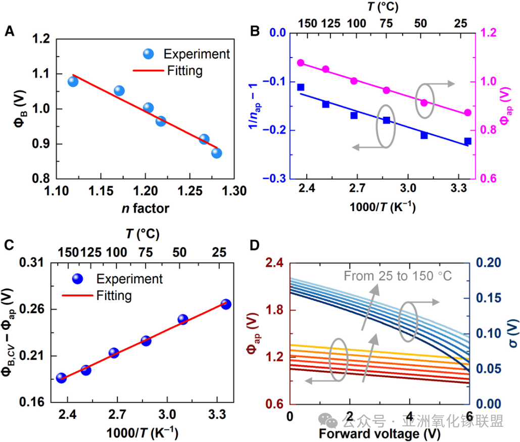 图 6 电压与温度依赖的势垒参数。(A) β-Ga2O3 SBD 在不同温度下测得的零偏置表观势垒高度 (ΦB,0) 与理想因子 (n) 的关系。(B) (1/nap−1) (蓝色三角) 与Φap (红色方块) 对 1,000/T 曲线。(C) (ΦB,CV − Φap)对 1,000/T 图。