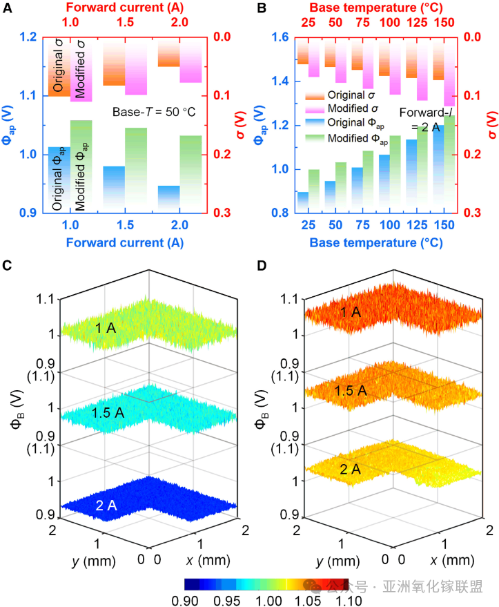 图 10 原始与修正模型的势垒参数对比。(A) 50 °C 基准温度下正向电流从 1 A 变化到 2 A。(B) 固定 2 A 正向电流,基准温度从 25 °C 变化到 150 °C。(C) 未进行温度修正的非均匀肖特基势垒 3D 分布。(D) 根据实测温度修正后的非均匀肖特基势垒 3D 分布。
