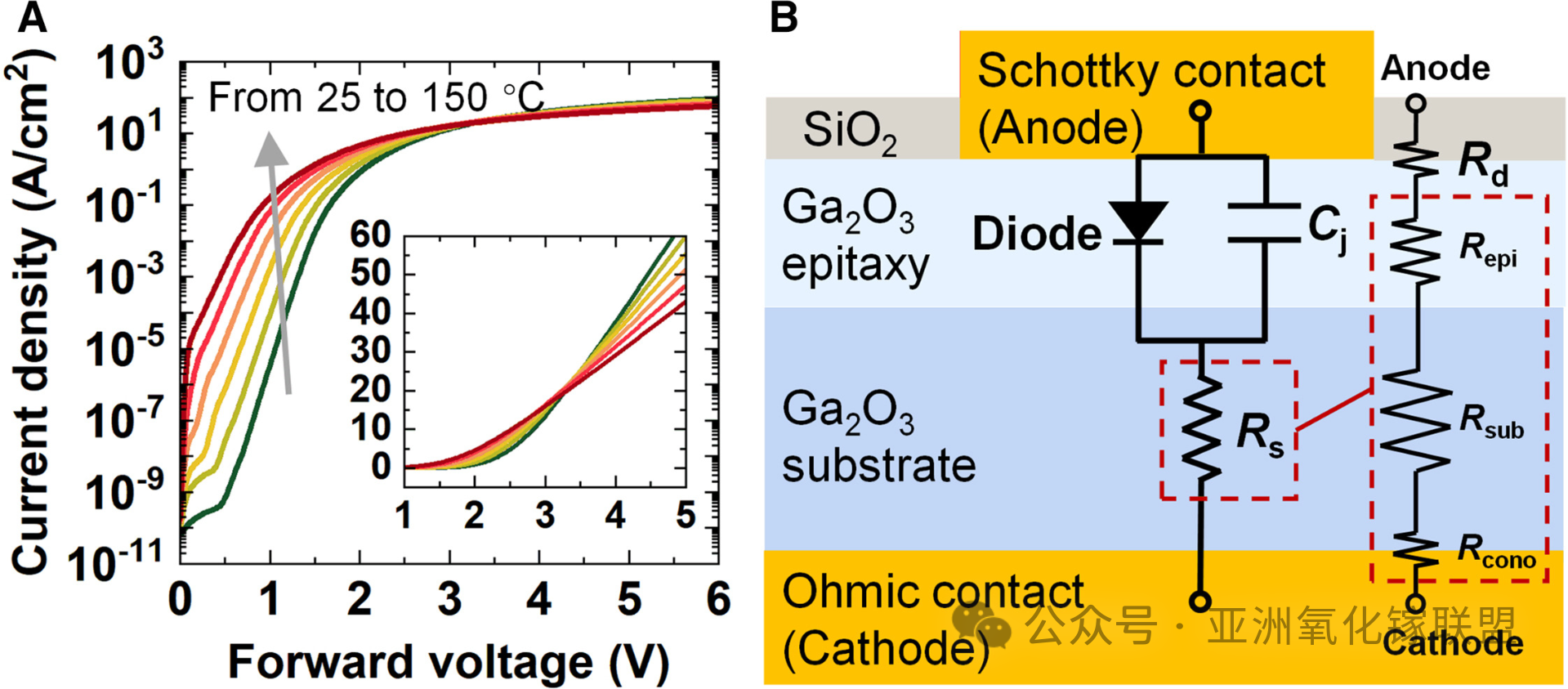 图 3 正向偏压 J-V 特性。(A) 25 °C–150 °C 下的半对数图,插图显示线性图。(B) 等效电路。