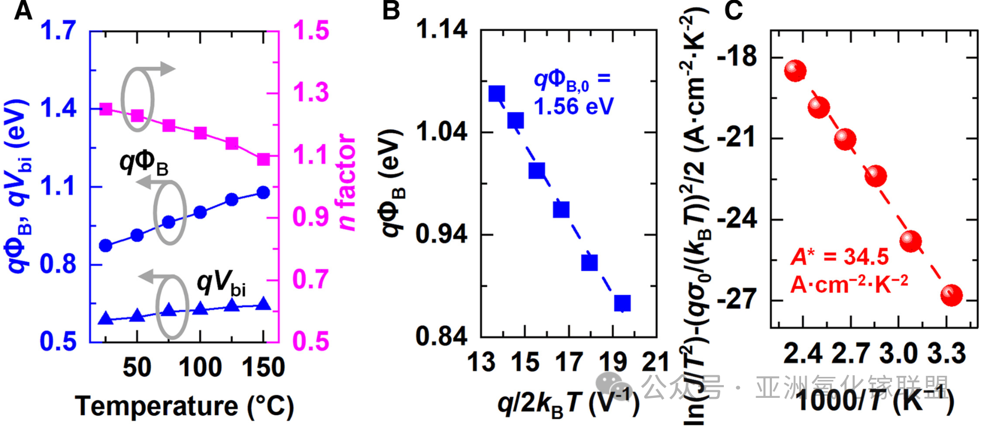 图 4 从正向偏压 J-V 特性提取的势垒参数。(A) 从正向 J-V-T 特性中提取的肖特基势垒高度 (qΦB)、内建电势 (qVbi) 和理想因子 (n) 随温度 T 的变化。(B) β-Ga2O3 SBD 的 qΦB 对 q/2kB 的图。(C) ln(Js/T2) – q2σ02/(2kB2T2)对 1,000/T 的 Richardson 图。