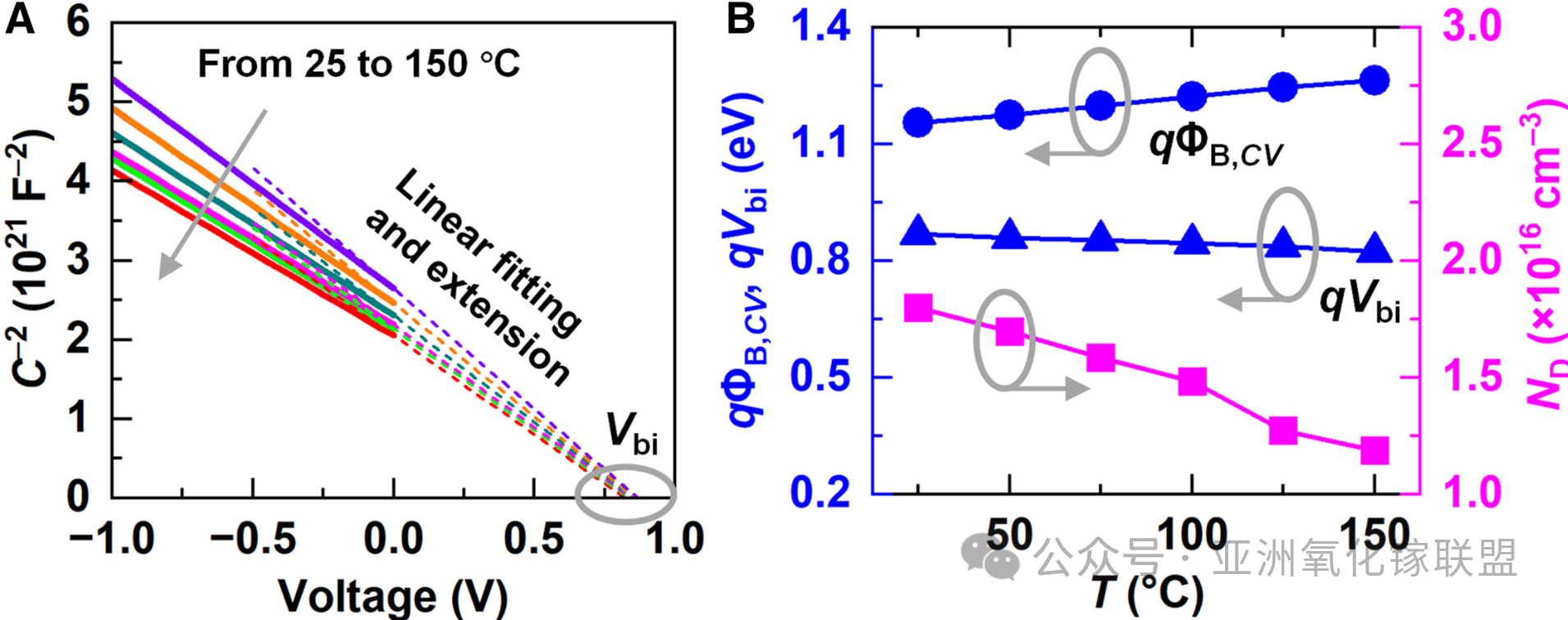 图 2 反向偏压 C-V 特性。(A) 制备的垂直 β-Ga2O3 SBD 在 25 °C–150 °C 温度范围内的 1/C²-V 特性曲线。(B) 从 C-V-T 特性中提取的内建电势 (qVbi)、肖特基势垒高度 (qΦB,CV)) 和净施主浓度 (ND) 随温度 T 的变化。