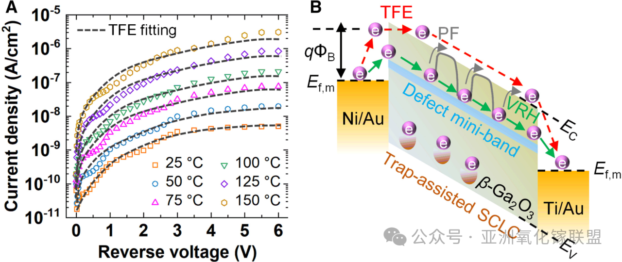 图 5 反向偏压 J-V 特性。(A) 制备的垂直 β-Ga2O3 SBD 的温度依赖反向 J-V 特性;红色虚线为热电子场发射 (TFE) 模型拟合。(B) TFE、变域跳跃 (VRH) 与陷阱辅助空间电荷限制导电 (SCLC) 机制示意图。实线蓝色表示 TFE 与 VRH 串联,虚线蓝色表示 25 °C–150 °C 下的 TFE 至导带。