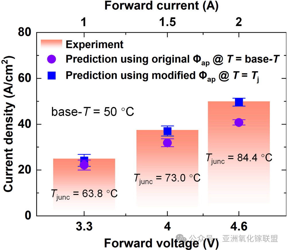 图 11 温度补偿前后正向偏压电流密度预测。在 50 °C 基准温度下,不同正向偏压条件下实验测得的电流密度与基于原始与修正Φap 计算值对比。误差棒表示由势垒不均匀性引起的电流预测不确定性。