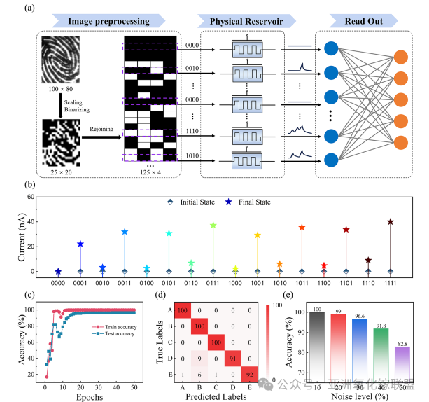图5. 基于 Ga2O3 薄膜晶体管的 RC 系统指纹识别演示。(a) 原始指纹图案经缩放与二值化预处理后,转化为脉冲序列输入晶体管型存储池框架。通过读取存储池状态感知网络获得识别结果。(b) 16 种脉冲组合刺激下存储池状态的初始与最终电流值。(c) 50 个训练 epoch 期间准确率演变曲线。(d) 识别结果混淆矩阵及各指纹图案出现概率。(e) 10 % 与 50 % 噪声水平下的识别准确率。