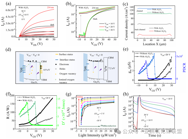 图3. 氧化铝涂层氧化镓薄膜晶体管的光响应特性及其作用机制。(a) 不同栅极电压下测得的氧化铝涂层氧化镓薄膜晶体管输出特性。(b) 不同漏极电压下获得的氧化铝涂层氧化镓薄膜晶体管转移特性。(c) 在日盲紫外线照射下,含/不含 Al2O3 层的 Ga2O3 薄膜晶体管沟道区与背沟道区电流密度分布(TCAD 模拟)。(d) 含 Al2O3 钝化层的 Ga2O3 薄膜晶体管能带结构示意图。(e) 跨导 (gm) 与光暗电流比 (PDCR) 随栅极电压变化曲线。(f) 响应度与探测度随栅极电压变化曲线。(g) 不同栅极电压下光电流对光强度的响应曲线。(h) 254 nm 紫外光照射下(光功率密度 24.68 μW/cm2,持续 30 秒)Ga2O3 薄膜晶体管的光响应 I-t 曲线(含/不含 Al2O3 钝化层)。