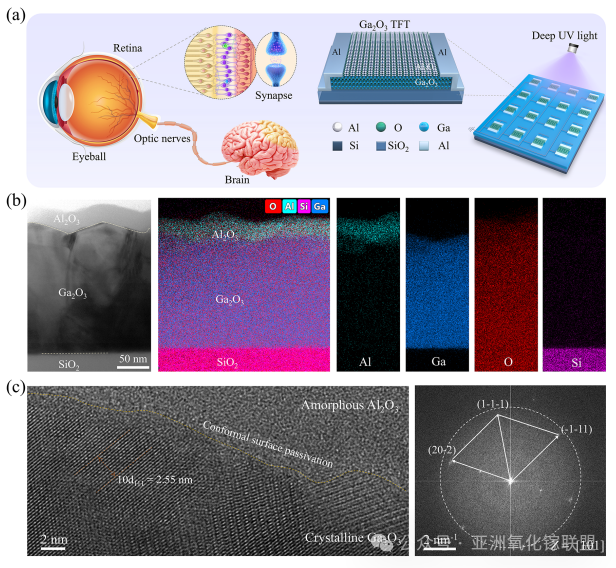 图1. 用于类脑视觉系统的 Ga2O3 薄膜晶体管。(a) 生物视觉系统示意图与基于 Ga2O3 薄膜晶体管阵列设计的神经形态视觉系统示意图。(b) 沉积于 SiO2/Si 衬底上的 Ga2O3/Al2O3 异质结薄膜的HAADF-STEM图像及对应元素(Al、Ga、O、Si)的能谱分布图。(c) Ga2O3/Al2O3 异质结的高分辨率透射电子显微镜图像,显示晶体 β-Ga2O3 表面覆盖的非晶态 Al2O3 层。对应的快速傅里叶变换衍射图(Z轴=[101])显示:非晶态 Al2O3 产生弥散晕环,β-Ga2O3 的 (20−2)、(11−1) 及 (1−11) 晶面则呈现离散衍射斑点。