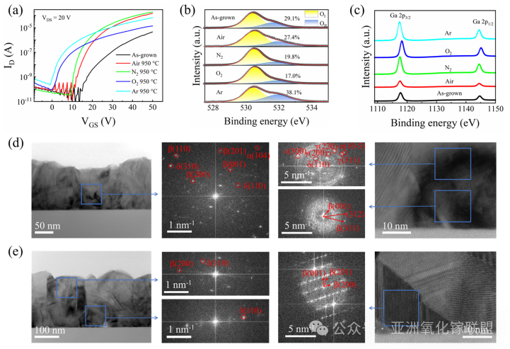 图2. Ga2O3 薄膜晶体管的电学性能增强。(a)Ga2O3 薄膜晶体管在不同气氛下退火前后的转移特性曲线。(b) 不同气氛退火后 Ga2O3 薄膜的 O 2p 能级谱;(c) Ga 2p3/2 能级谱。HAADFSTEM 图像显示:(d) 原始生长状态与 (e) 退火处理后的 Ga2O3 薄膜,并附低/高倍放大区域的 FFT 衍射图谱。