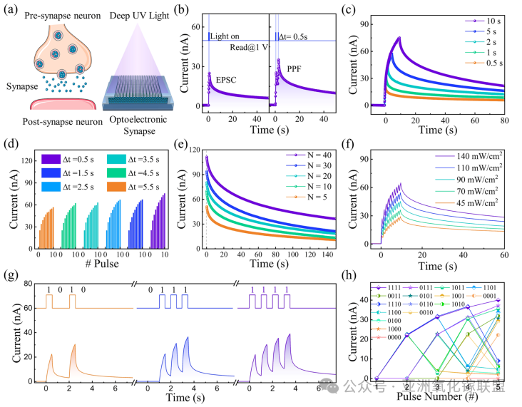 图4. 基于 Ga2O3 薄膜晶体管(TFT)实现的 4 位输入突触可塑性与非线性映射。(a) 生物突触与 Ga2O3 薄膜晶体管示意图。(b) 单次紫外脉冲(140 mW/cm2,0.5 s)与一对尖峰(Δt = 0.5 s)分别诱发的突触 EPSC 与 PPF 函数。(c) 不同时间点紫外脉冲作用下晶体管的 EPSC 响应。光脉冲诱导的响应电流随(d)间隔时间(0.5 至 5.5 秒)、(e) 脉冲数量(5 至 40 次)及 (f) 光强(45 至 140 mW/cm2)的变化曲线。(g) 光输入(强度 140 mW/cm2)下 1010、0111 和 1111 通道电流的响应特性。(h) 在 1 V VDS 条件下,4 位存储池状态读取的可区分输出。
