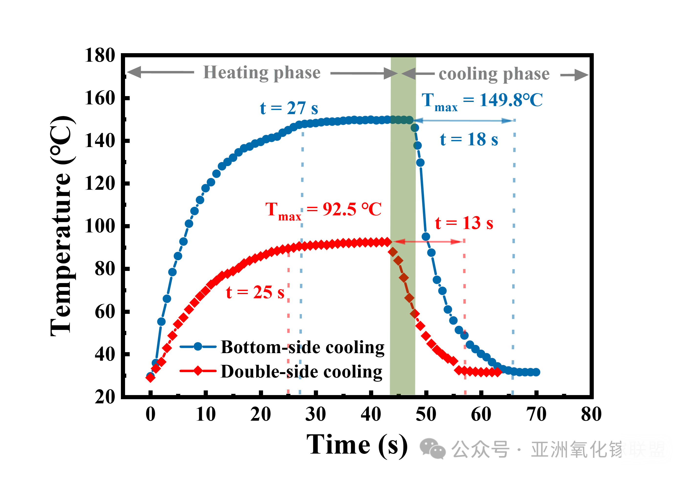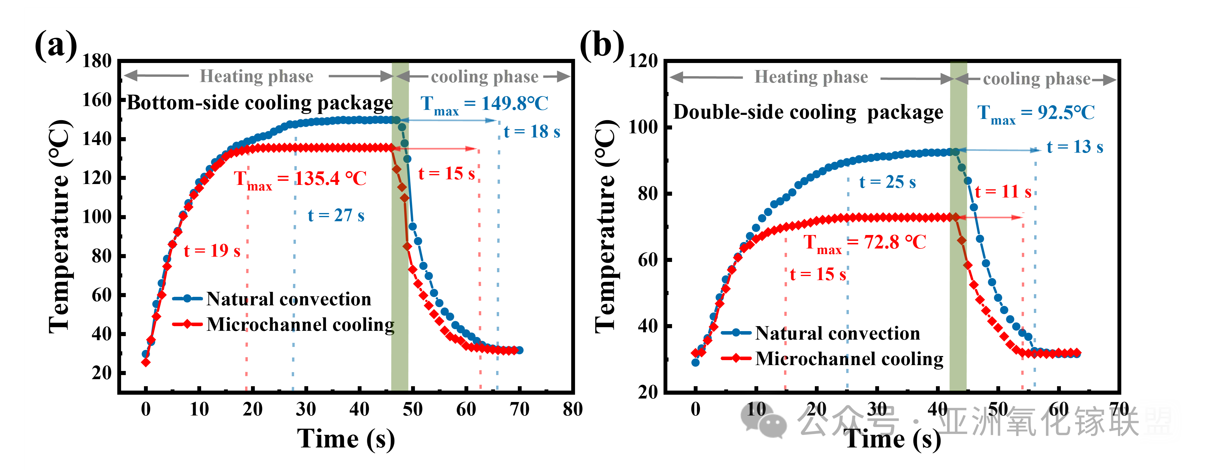 图8. (a) 底部封装器件在 2.8 W 自然对流冷却与 2.85 W 微通道冷却下的瞬态热响应。(b) 双面封装器件在 3.3 W 自然对流冷却与 3.2 W 微通道冷却下的瞬态热响应。