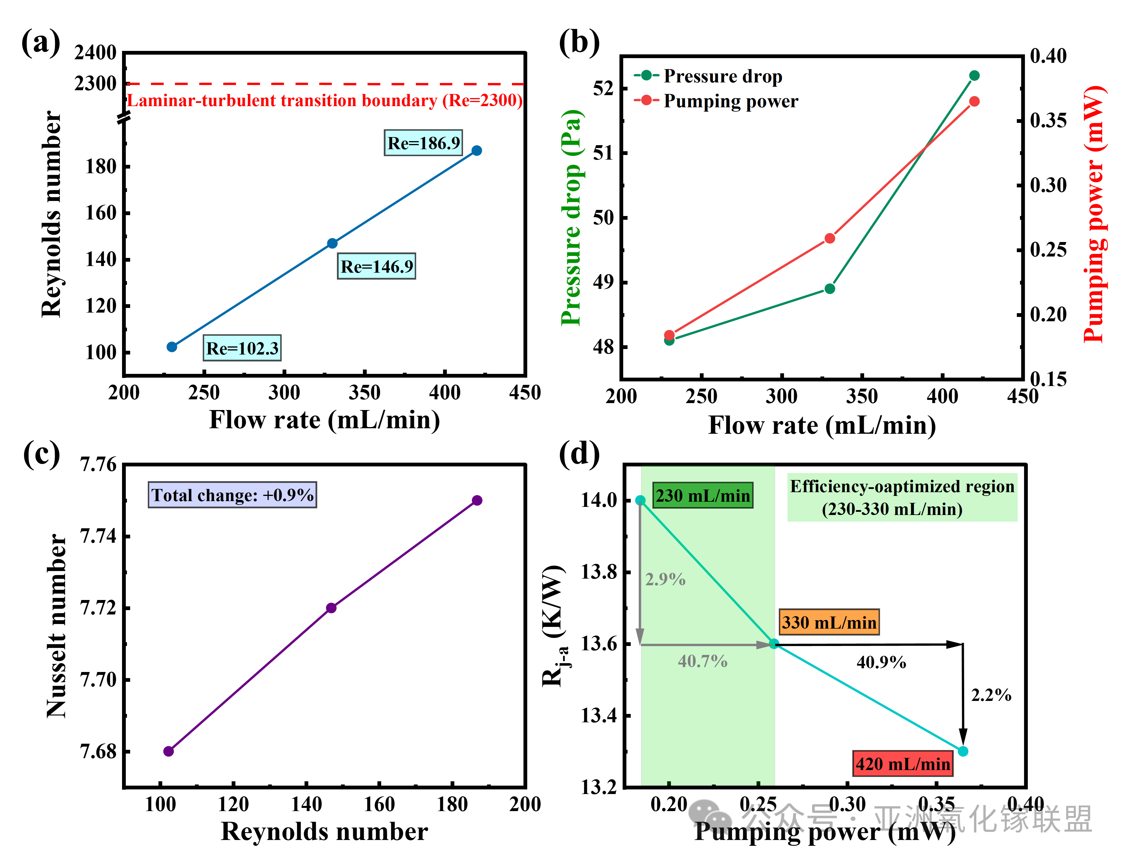 图7. (a) 雷诺数与流速的关系。 (b) 压降与泵送功率随流速的变化。 (c) 努塞尔数与雷诺数的关系。 (d) 热阻与泵送功率的权衡关系。
