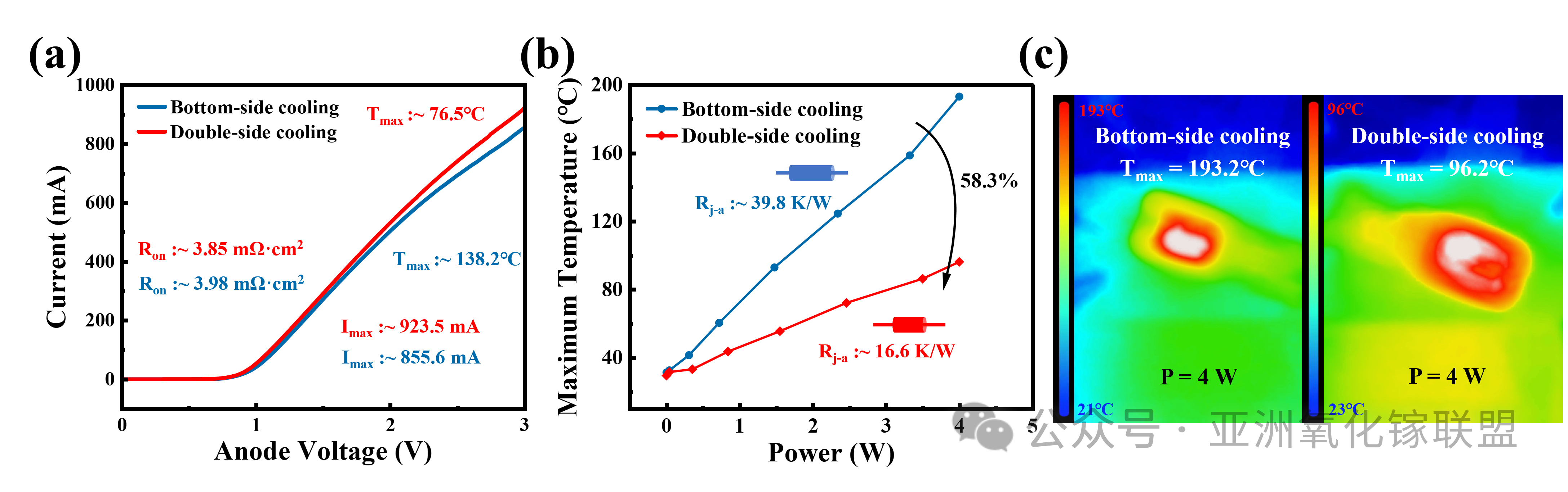 图2. (a) 双面封装与底面封装器件的正向 I-V 特性曲线。(b) 两种封装器件表面温度与功耗的关系曲线。(c) 4 W 功耗下器件表面的红外热成像图:左侧为底面封装器件,右侧为双面封装器件。
