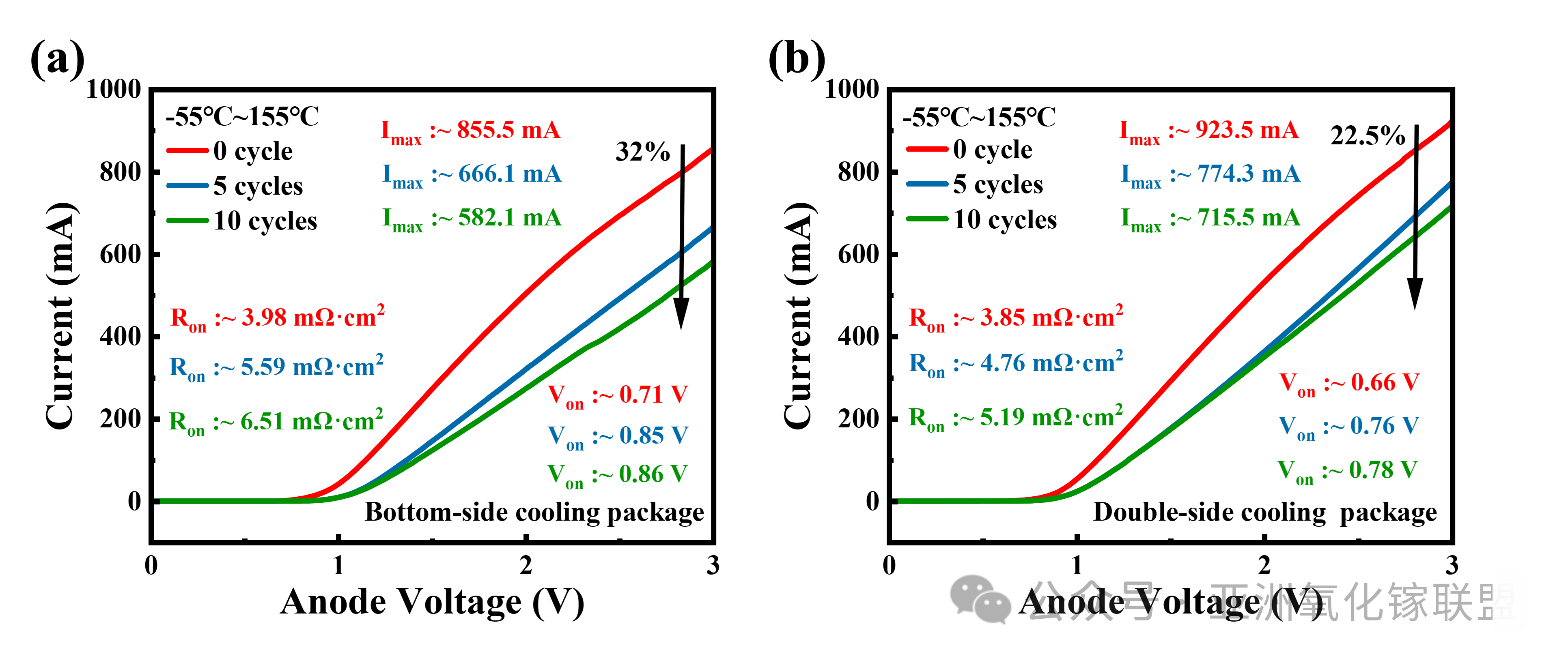 图5. (a) 底部封装和 (b) 双面封装器件在 -55 ℃ 至 150 ℃ 温度循环测试后的输出特性。