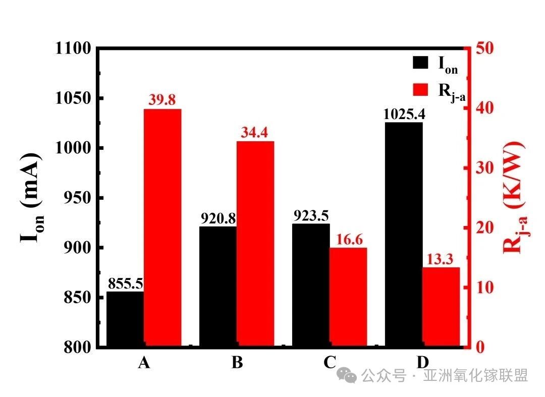 图9. 不同冷却方式下阳极电压为 3 V 时的导通电流与热阻性能对比(A:底部自然对流冷却;B:底部微通道冷却;C:双侧自然对流冷却;D:双侧微通道冷却)。