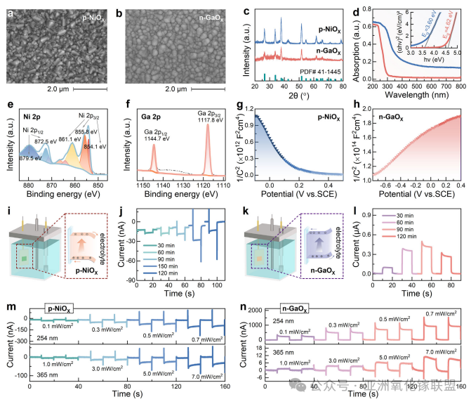 图2. p-NiOX 与 n-GaOX 光电化学电极的结构与光电化学表征。(a,b) p-NiOX 与 n-GaOX 薄膜的顶视场扫描电子显微镜图像。(c) 掠入射 X 射线衍射(GI-XRD)图谱仅显示FTO基板衍射峰,表明两薄膜均为非晶态。(d) 紫外-可见吸收光谱及对应的 Tauc 图 ((αhν)2 vs. hν),用于估算光学带隙。(e,f) Ni 2p 与 Ga 2p 区域的 XPS 光谱,证实存在混合价态 Ni2+/Ni3+ 及典型 Ga 氧化态。(g,h) 莫特-肖特基图揭示 NiOX 呈现 p 型导电性,GaOX 表现为 n 型行为。(i,k) p-NiOX 与 n-GaOX 器件光电化学测量装置示意图。(j,l) p-NiOX 与 n-GaOX 光电化学探测器在 254 和 365 nm 光照下、不同溅射时长条件下的瞬态光电流 (I-t) 曲线。(m,n) p-NiOX 与 n-GaOX 光电倍增二极管在 254 和 365 nm 波长下不同光照强度下的零偏压光电流响应。