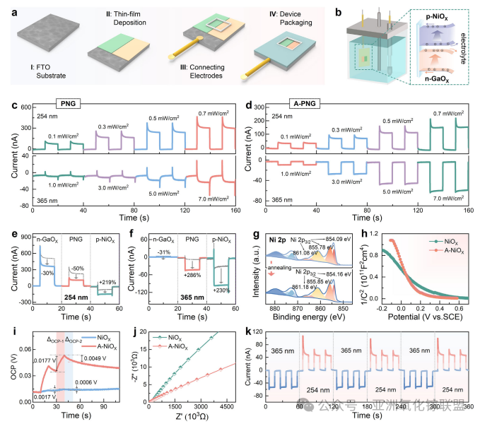 图3. PNG 光电化学探测器(PNG PEC-PDs)的制备与光电特性表征。(a,b) PNG PEC-PDs 的制备流程示意图及光电化学测量系统。(c) PNG 器件在 254 nm 和 365 nm 波长下不同光强照射下的光电流响应曲线。(d) 退火 PNG 器件 (A-PNG) 在相同照射条件下的光电流响应。(e,f) 退火对单个 n-GaOX 和 p-NiOX 光电化学探测器协同效应及其在 254 和 365 nm 照射下对 PNG 器件整体响应的贡献。(g) p-NiOX 光电化学探测器退火前后的 Ni 2p XPS 谱。(h) p-NiOX 光电化学探测器在 254 和 365 nm 照射下 Mott-Schottky 图谱,显示载流子浓度变化。(i) p-NiOX 光电化学探测器在 254 和 365 nm 照射下光电流响应曲线。(g) 退火前后 p-NiOX 光电化学探测器 Ni 2p XPS 光谱。(h) 显示退火诱导载流子浓度变化的 p-NiOX 光电化学探测器莫特-肖特基图。(i) 退火后显示增强光伏电势的 p-NiOX 光电化学探测器开路电位曲线。(j) 退火前后 p-NiOX 光电二极管的电化学阻抗谱(EIS)。(k) A-PNG 光电二极管在 254 与 365 nm 交替照射下正负光电流动态切换现象。