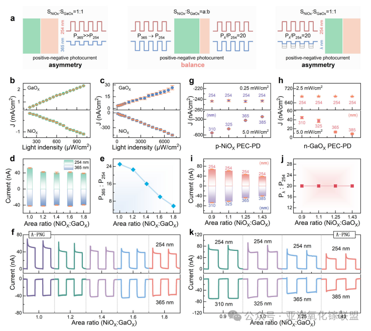 图4. A-PNG 光电化学探测器中光电流平衡的几何工程策略。(a) 通过几何工程(GE)匹配激发区域以平衡正负光电流的示意图。(b,c) 单个 n-GaOX 与 p-NiOX PEC-PD 的光功率密度-电流密度 (P-J) 关系曲线,J=I/0.28 cm2。(d,e) 不同面积比下,254 nm 与 365 nm 照明条件下的模拟光电流及所需光功率比。(f) 不同面积比下A-PNG光电倍增管在双波长照射下的实验光电流响应。(g,h) n-GaOX 与 p-NiOX 光电倍增管在多重正负响应波长下的 P–J 曲线。(i,j) 不同正负波长组合下各面积比对应的计算光电流及最优光功率比。(k) 不同波长组合与面积比下 A-PNG 光电倍增管光电流平衡的实验验证。