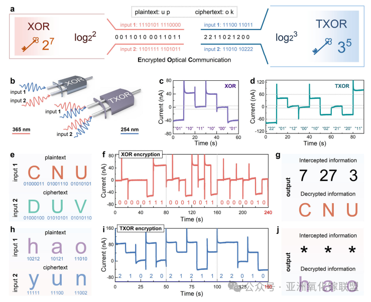 图5 基于平衡正负光电流的并行双极性 PEC-PD 实现的逻辑运算与加密光通信。(a) XOR 与 TXOR 加密方案的信息吞吐量及密钥空间对比。(b) 基于并行PEC-PD的波长编码可重构 XOR/TXOR 逻辑门示意图。(c,d) XOR 与 TXOR 操作下,254nm 与 365nm 光照条件对应逻辑状态的光电流响应。(e–g) 基于异或逻辑的二进制光通信加密演示,包含传输明文与密文、同步照射下的输出光电流,以及有/无密钥的解密结果。(h–j) 基于同或逻辑的三进制加密光通信演示,展示传输明文与密文、复合照射下的输出光电流,以及有/无密钥的解密结果。
