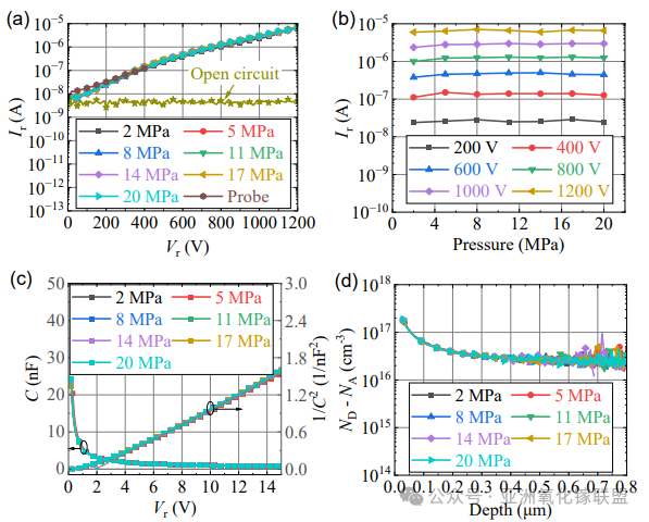 •实验证明,在 2 MPa 到 20 MPa 的压力范围内,器件的反向漏电流保持稳定,且肖特基势垒高度未受影响,表明高压未造成机械损伤或引入电学缺陷。