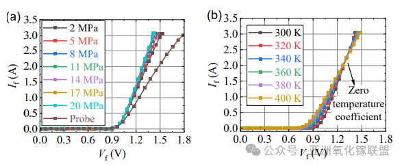 图3. 压制封装 β-Ga2O3 反向偏压二极管的 If–Vf 特性曲线。(a) 不同压力下的 If–Vf 曲线及探针测试结果。(b) 不同结温下的 If–Vf 曲线。