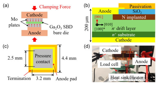 图1. 压制封装 β-Ga2O3 反向偏置二极管示意图及实验装置。(a)压制封装 β-Ga2O3 SBD 结构设计。(b)β-Ga2O3 SBD 芯片横截面。(c) β-Ga2O3 SBD 芯片阳极侧视图。(d) 配备双面散热器/加热器的定制压制封装实验装置实景图。