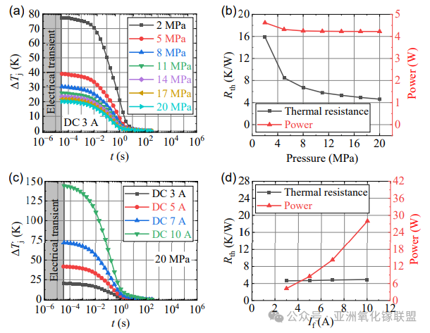 图4. 压制封装 β-Ga2O3 肖特基二极管的热特性。(a) 采用 3 A 直流加热后,不同压力下冷却期的 ΔTj 变化。(b) 不同压力下计算的加热功率与热阻 Rth。(c) 不同直流加热电流下,20 MPa 压力条件下冷却期的 ΔTj 变化。(d) 不同直流加热电流下计算的加热功率与热阻 Rth。