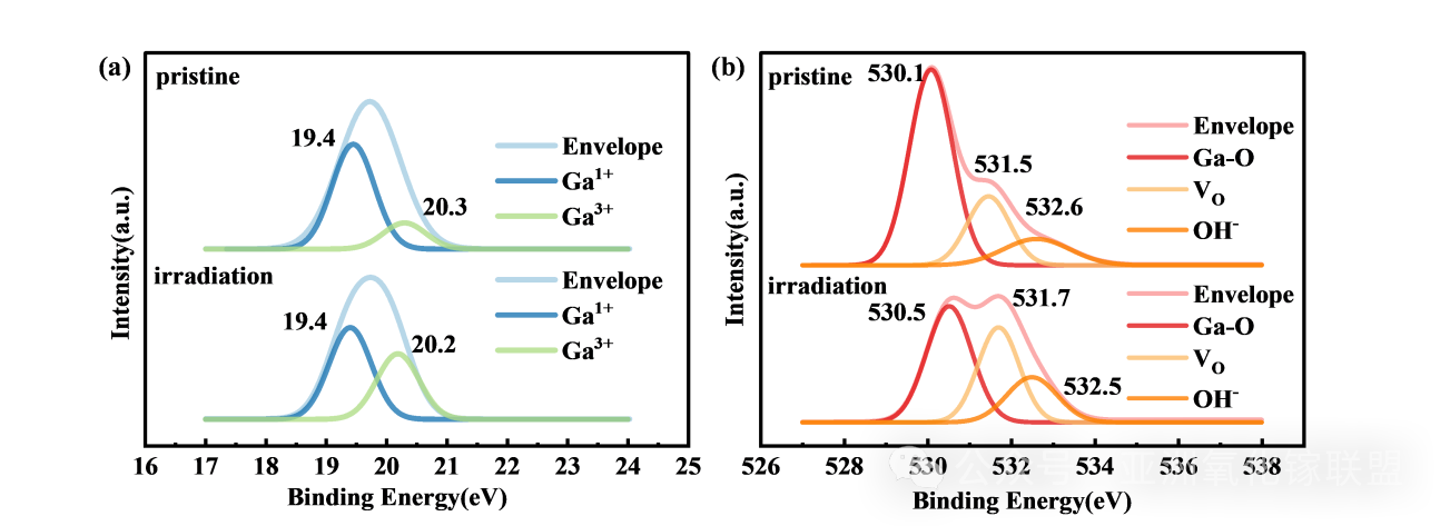 图4. (a) 170 keV质子辐照前后Ga3d能级的高斯拟合XPS谱图。(b) 170 keV质子辐照前后O1s能级的高斯拟合XPS谱图。
