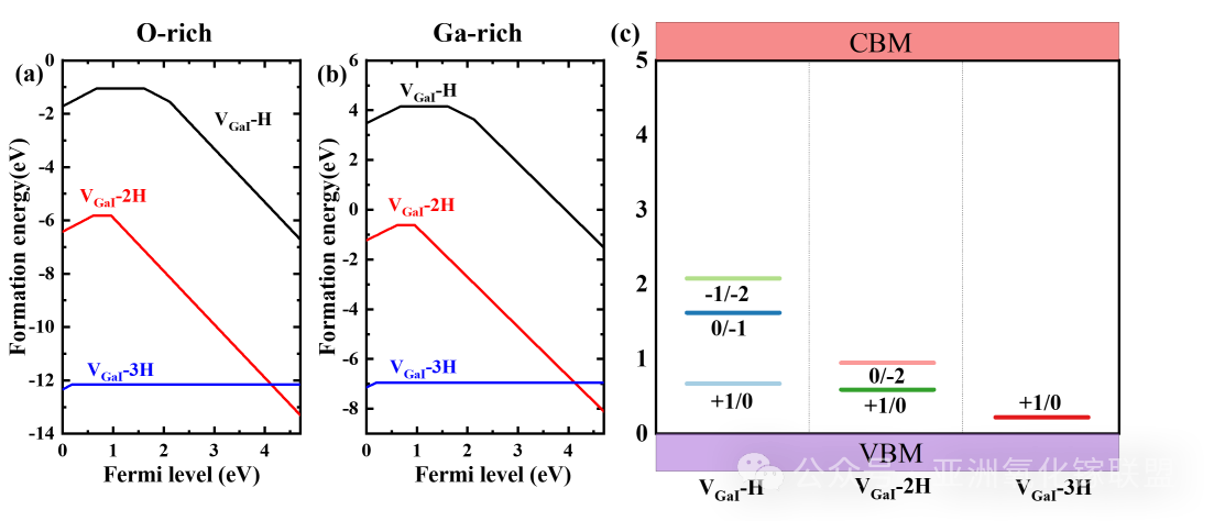 图5. (a) 富氧条件下 VGaI-H、VGaI-2H、VGaI-3H 复合体形成能随费米能级的变化关系。(b) 富镓条件下VGaI-H、VGaI-2H、VGaI-3H 复合体形成能随费米能级的变化关系。(c)β-Ga2O3 中 VGaI-H、VGaI-2H、VGaI-3H 复合体缺陷的电荷转变能级。