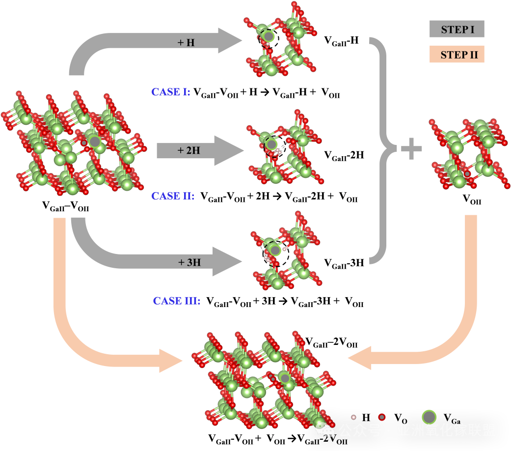 图6. 170keV质子辐照诱发β-Ga2O3 SBD缺陷演化路径示意图。步骤Ⅰ:镓空位的氢钝化过程;步骤Ⅱ:三空位复合体的形成过程。