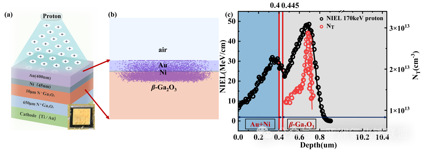 图1. (a) 170 keV质子辐照下β-Ga2O3 SBD的结构示意图。(b)β-Ga2O3 SBD中入射质子的模拟分布。(c) β-Ga2O3 SBD的非电离能量损失(NIEL)与缺陷浓度(NT)深度分布图,右侧附器件的光学显微镜(OM)图像。