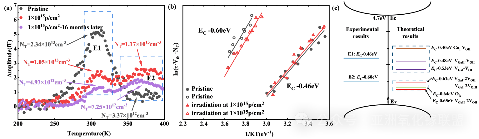 图3. (a)β-Ga2O3 SBD在1×1015p/cm2质子辐照前后的DLTS谱图,紫色曲线对应室温储存16个月后的样品。(b) DLTS的阿伦尼乌斯拟合曲线。(c) β-Ga2O3 禁带内缺陷的实验与理论电荷跃迁能级对比示意图。
